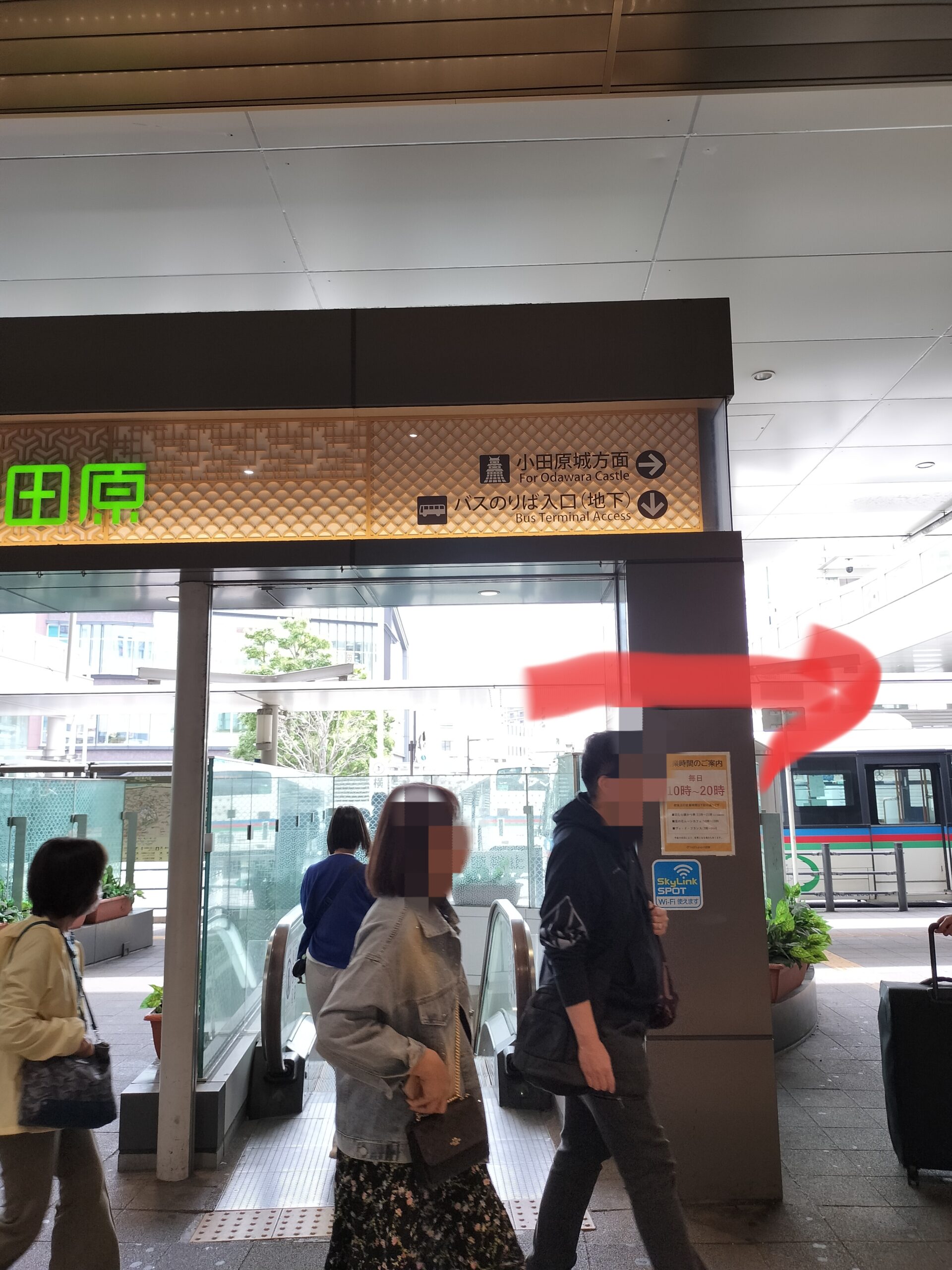 階段を降りたら、右方向(小田原城方面)に向かいます。バスを使う方は、バス乗り場入口は地下から向かうので階段またはエスカレーターで下に降りてください。