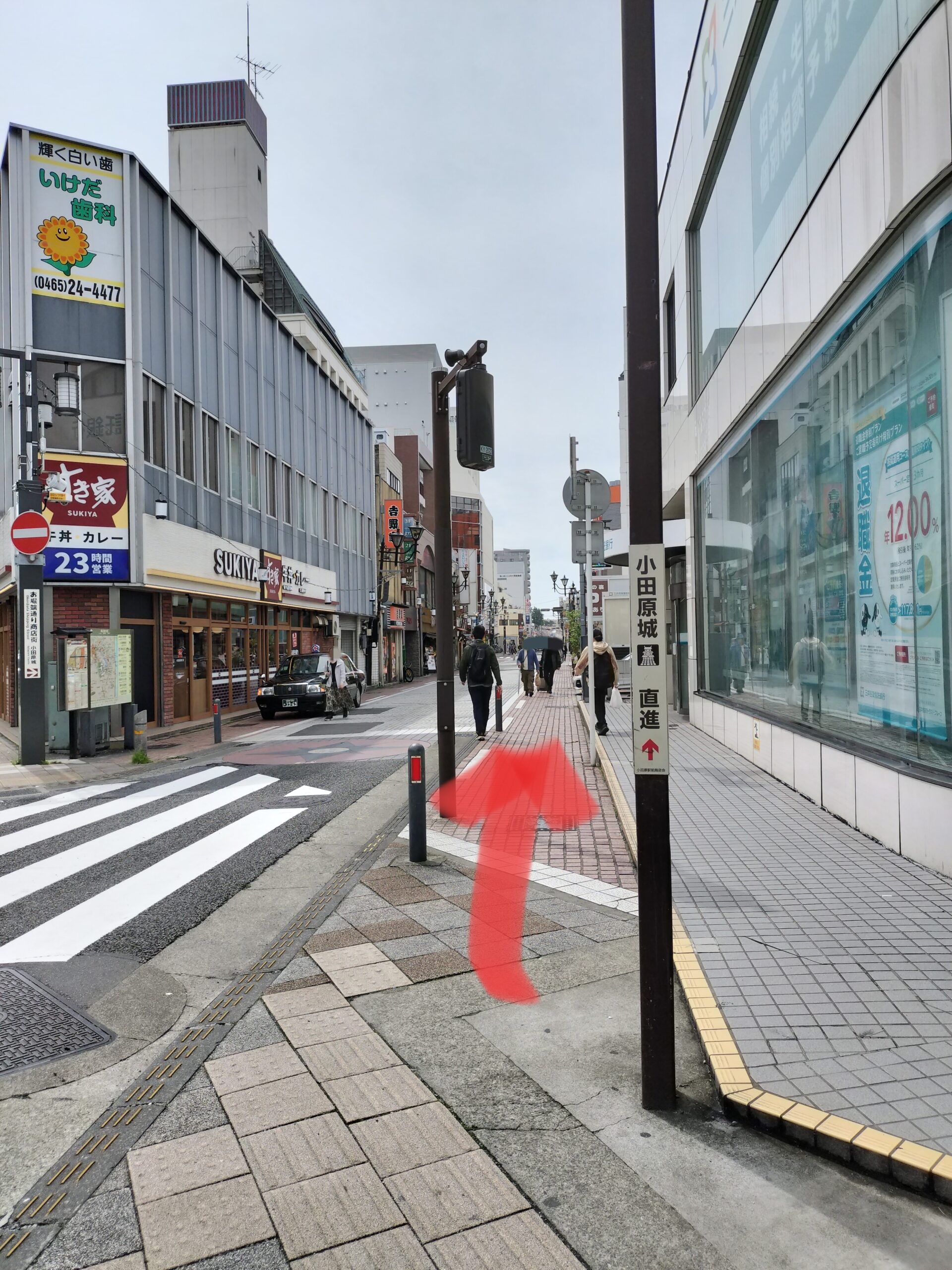 If you go to the right direction (in the direction of Odawara Castle), you will find a crosswalk, so you will go to the one with the roof. On the right is Suzuhiro, Odawara’s specialty kamaboko restaurant