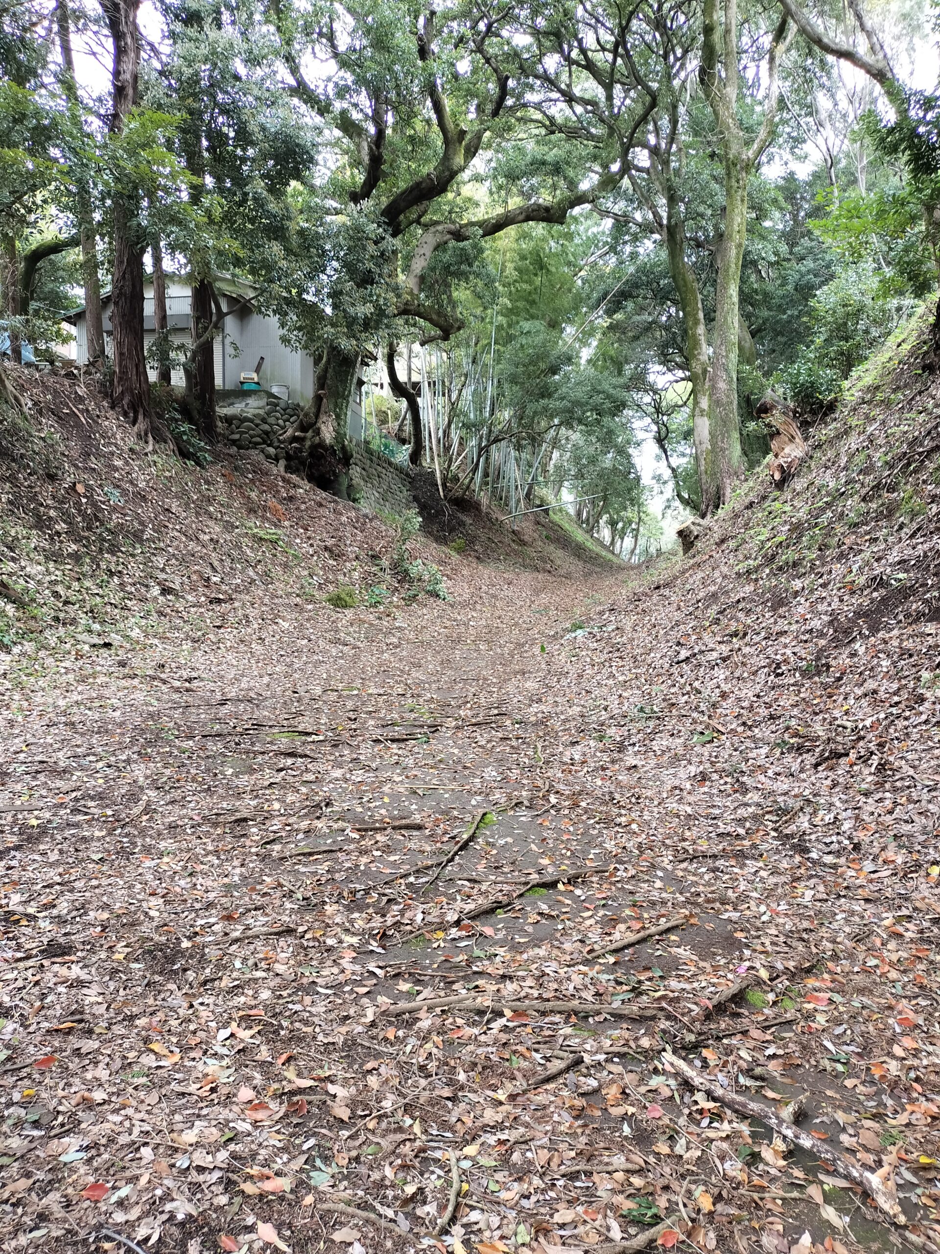法面を少し登ってみましたが、角度が急なため上のほうまで登るのは難しいと感じました。重たい甲冑をつけていた当時の武士たちはもっと登るのが難しかったはずです